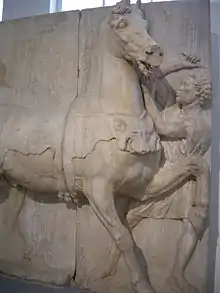 The Pentelic marble relief consists of two plates and there must have been a third piece on the left hand side, containing at least the tail of the horse. The central figure of the relief is a horse moving to the right, with its head pulled upwards away from the right edge of the relief. A portion of the horses nose is missing, the only substantial damage to the piece. Its left foreleg is raised and bent, the right is stretched out and planted firmly in the ground. The hind legs reinforce the horse's position, the left hind leg is in very low relief, only barely extending out of the surface. On the horse's back is a panther pelt, which is attached around its front. At the front, to its left, stands a stable boy who reaches up to strike the horse with a whip, as the pained posture of the horse's head makes clear. The boy wears a chiton. His hair is cut short, but the pattern of the locks indicates that he is an exotic foreigner. It is probably that he is an African slave, most likely from Ethiopia.