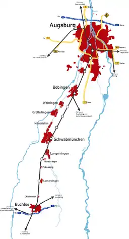 The Augsburg–Buchloe railway is a double-track main line in the German state of Bavaria. It runs from Augsburg to Buchloe. Other major towns on the route are Bobingen and Schwabmünchen. It was built as part of the Ludwig South-North Railway, one of the oldest lines in Germany.