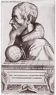 Hirschvogel took up etching late in his career, and almost all of his prints date from the last decade of his life, when he resided in Vienna. His etchings, numbering about 300, "reflect his concern with Italianate problems of space, form, and ornament",[3] and include portraiture, cartography, and book ornamentation. He was among the first etchers to use copper rather than iron plates. He contributed 23 etchings to Sigismund von Herberstein's 1549 edition of Rerum Moscoviticarum Commentarii (Notes on Muscovite Affairs), and more than 100 Old and New Testament illustrations for the verses of Hungarian reformer Péter Perényi (1502–48). A series of 53 hunting scenes for stained glass are of questionable authorship, but Peters asserts that they are by Hirschvogel. Hirschvogel is credited with the single authentic portrait of the Swiss physician Paracelsus, but this attribution is not certain.[4]