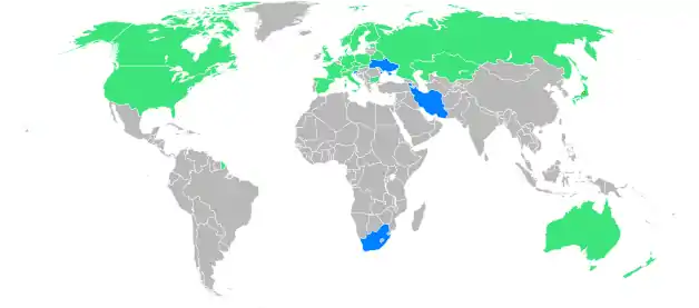 Map of countries participating in the 1998 Winter Paralympics. Blue = Countries participating for the first time, Green = Countries who have previously participated in a Winter Paralympics, Yellow Square = Host City, Nagano, Japan.