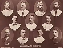 The 1884 Australian cricket team. Back row (l-r) Percy McDonnell, George Alexander (manager), George Giffen, Joey Palmer. Middle row (l-r) Fred Spofforth, Jack Blackham, Billy Murdoch, George Bonnor, Billy Midwinter, Alick Bannerman, Harry Boyle. Front row (l-r) William Cooper, Tup Scott.