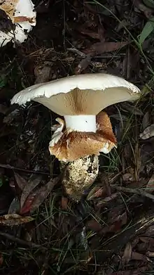 The fruitbodies of this fungus have convex to flattened caps with diameters typically in the range 5 to 7.5 cm (2.0 to 3.0 in),[11] although specimens up to 30 cm (12 in) have been noted.[12] There is no discernible odour.[3] The cap colour is whitish with brown tints, and ragged fragments of the partial veil often remain attached to the cap margin. The stipe is bulbous, with dimensions of 15 cm (5.9 in) long and 3.7–6.2 cm (1.5–2.4 in), although it is often much smaller than this. The gills on the cap underside have an initially adnate attachment to the stipe and pale straw colour; later, the gill attachment becomes sinuate to nearly free, and colour deepens to rusty brown as the spores mature.[11] The gills can be up to 1 cm (0.4 in) deep.[12] Remnants of a ring often persist on the stipe until maturity, as well as bits of the universal veil that once enclosed the immature mushroom.[11] The ring is often stained dark brown from the spores falling from the gills.[12] The ellipsoid to almond-shaped spores measure 10–13 by 5.4–6.9 µm,[11] and turn yellowish brown in KOH. Western Australian specimens have slightly larger spores, averaging 11.1 by 5.9 µm.[12]