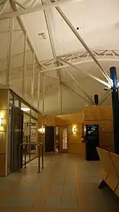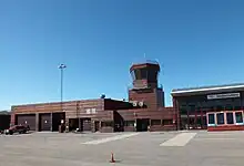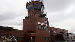 The terminal consists of a single building, with an integrated control tower, capable of handling 120 passengers per hour.[16] The facade is covered in Russian larch;[17] the focus on wood as a dominant material was common for Norwegian architecture the 1990s, and is also seen at Oslo Airport, Gardermoen (opened in 1998) and for the venues of the 1994 Winter Olympics.[6] The terminal was designed by Alta-based architect Solveig Thorsen and is shaped like an aircraft wing, similar to the terminal building at Gardermoen. There is a single gate at the airport, which prior to the installation of security control was 17 steps from the entrance.[17]