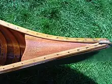 Ribs are 3/8 inch thick rather than the more common 5/16 inch and are tapered to about 1-1/8 inch wide at the tip. In closed gunwale canoes, the ends of ribs are inserted into mortices in the inwale.
