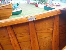 When the shop behind the family home became too small for the growing company, it was replaced by a large factory-complex consisting of nine buildings, each serving a step in the canoe-building process.[2] Although Morris was not the first to market canvas-covered canoes, it was among the first to distribute through a system of dealerships.[4] In the early years of the twentieth century, Morris began offering a less expensive factory-direct line of canoes under the name "Veazie Canoe Company". These canoes were identical to those carrying the B.N. Morris name with the exception of being trimmed in ash or maple rather than high grade mahogany.[5]