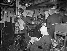 Handling cordite charges inside a Mk XXIII turret aboard HMS Jamaica, 1943