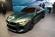 BMW revived the 8 Series nameplate by introducing the M8 GTE racecar (a first by BMW, as the brand usually introduces the production version first), which replaced the M6 GTLM at the end of the 2017 season of the IMSA WeatherTech SportsCar Championship, leading to speculation about a production equivalent to the racing car.[9] At the 2018 Geneva Motor Show, BMW introduced the M8 Gran Coupé Concept, which previewed a high performance four-door variant of the Concept 8 Series introduced alongside the M8 GTE at the 2017 Frankfurt Motor Show. The design of the concept was based on the M8 GTE and sported aggressive M performance visual parts.[10] Prototypes of the M8 began testing in June 2017 when another Concept of the 8 Series was unveiled to the public.[11]