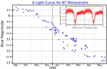 Light curves for BT Monocerotis. The main plot, adapted from Schaefer and Patterson (1983),[7] shows the decline from the 1939 nova eruption, and the inset plot, from TESS data,[8] shows the post-eruption brightness fluctuations during an orbital period.