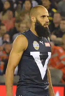 Houli suffered a minor calf injury in the club's opening pre-season match of 2018, the recovery for which held him out of the rest of the pre-season series and from the round 1 match-up against Carlton.[154][155][156] He returned to fitness for round 2's grand final rematch against Adelaide and contributed 17 disposals.[157][23] AFL Media named Houli among Richmond's best players in four of the next five matches, including in his 150th match for Richmond in round 7.[158][159][160][161] In the first quarter of round 10's match against St Kilda, Houli suffered a serious groin injury while kicking that saw him removed from the game after notching just four disposals.[162] Although the injury did not require surgery, Houli spent six weeks rehabilitating the muscle, during which time he also underwent finger surgery to repair an unrelated injury.[163][164][165] He made a return to football in round 17, but further groin soreness forced him to limit the stint to just one match.[166][167] Houli spent a further two weeks on the sidelines before making a return to football in limited game time in one VFL match in early August.[168][169] Finally fit, Houli played at AFL level again in round 21 and earned one coaches vote for a 26-disposal outing against Gold Coast.[170][171] Houli was an honoury captain the following week, joining fellow Muslim player and Essendon opponent Adam Saad to toss the coin in support of the Muslim-Australian community who had been the subject of Islamophobic comments by conservative Senator Fraser Anning in Parliament that week.[172][173] After helping Richmond to the minor premiership as the ladder-leading side at the end of the home-and-away season, Houli contributed 24 disposals and four tackles in a qualifying final win over Hawthorn.[23][174] Houli was one of Richmond's few strong contributors in the preliminary final the following week, notching up 22 disposals and a goal in what would prove a shock knockout loss to Collingwood that ended Richmond's season and limited Houli to just 15 matches at AFL level that year.[175][176]
