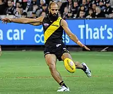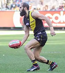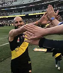 Houli signed a new two-year contract extension before the start of the 2014 season and started the year averaging 20 disposals per game over the first eight matches of the season.[95][23] He played his 100th AFL match in a 113-point demolition of Greater Western Sydney in round 10, in which he managed 26 disposals and kicked two goals.[23] Four weeks later he recorded a then-career-high 33 disposals in a loss to Sydney.[23] Through the first 16 rounds of the year, Houli was having what club legend and media commentator Matthew Richardson described as "a fairly consistent season", but it round 17 he put in what Richardson called Houli's best game of the year.[96] For a performance that included 23 disposals, seven rebound-50s and a goal in that win over Port Adelaide, Houli was also labelled the equal-best player on field by The Age.[97][23] In round 22 Houli recorded an equal-game high 29 disposals, after which point he ranked 14th in the league for total uncontested possessions that season.[98][99] Houli featured in Richmond's finals campaign in 2014, but was again limited to one game when his side was knocked out in an elimination final loss to Port Adelaide.[100] He was among his side's best players in the loss, with 27 disposals and four marks.[23][101] Later that month, Houli represented Richmond in Grand Final sprint during the game's half-time break.[102] Houli finished the season having played all 23 matches that year including one final, and placed ninth in the club's best and fairest award.[103][23]