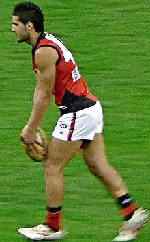 He first represented Essendon in an exhibition match against the Indigenous All-Stars in Darwin in early February 2007.[19][20] Houli spent the opening weeks of the season playing reserves-grade football with the club's VFL-affiliate Bendigo Bombers, where he played as a half-forward and midfielder and recorded 30 or more disposals in three of his first five matches.[21] Following those performances, he earned an AFL debut in a round 7 match against the Kangaroos, where he recorded 15 disposals and kicked a goal with his first kick in AFL football.[22][23][24] Houli followed that effort with a two-goal showing in round 8, before lesser performances in round 9 and 10 saw him returned to VFL level for the rest of the 2007 season.[23] He finished the year having played four AFL matches and averaged 11 disposals and 0.75 goals per game.[23]