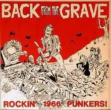 Back from the Grave, Volume 1 is the first installment in the Back from the Grave series of garage rock compilations put together by Tim Warren of Crypt Records and released in 1983 on LP.[1][2][3] In keeping with all of the entries in the series, and as indicated in the subheading which reads "Rockin' 1966 Punkers," this collection consists of songs which display the rawer and more aggressive side of the genre and are often characterized by the use of fuzztone-distorted guitars and rough vocals.[2][4] The set generally excludes psychedelic, folk rock, and pop-influenced material in favor of basic primitive rock and roll.[2][4] The packaging features well-researched liner notes written by Tim Warren which convey basic information about each song and group, such as origin, recording date, and biographical sketches, usually written in a conversational style that includes occasional slang, anecdotes, humorous asides.[4] The liner notes are noticeably opinionated, sometimes engaging in tongue-in-cheek insults directed at other genres of music.[4] The packaging also includes photographs of the bands, and the front cover features a highly satirical cartoon by Mort Todd depicting a revivified "rock and roll" zombie who, along with his macabre cohorts, has just emerged from the grave to "bury" all specimens of supposedly "heretical" pop and progressive music which have come to prominence over the years, such as disco music and MTV.[5][4]