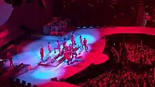 "Bad Idea" was included on the set list of Grande's Sweetener World Tour, which started in 2019.[46][47] While performing the track, the singer wore a red latex outfit (later a purple outfit), with opaque, red lights projected onto the stage as she danced with back-up dancers.[46] The choreography showed her reject a man and hug a woman.[12] Brittany Spanos of Rolling Stone wrote Grande used "playful, narrative-heavy choreography and played into a more villainous, dangerous side of herself."[46] Celia Almedia of the Miami New Times reviewed the show at the American Airlines Arena in Miami, saying that Grande performed the track with "high energy", but noted she "struggled to stand out amidst a sea of backup dancers, props, and ham-fisted dance routines". Almedia also pointed out that Grande was a more talented vocalist than dancer.[48] David Lindquist of The Indianapolis Star said the singer opened up "the top of her vocal range in ways rarely encountered at an arena show" during her concert at the Bankers Life Fieldhouse in Indianapolis.[12]