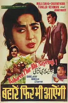 Baharen Phir Bhi Aayengi (transl.Spring will still come) is a 1966 Hindi-language romantic-tragedy film produced by Guru Dutt and directed by Shaheed Latif, actual name Shahid Lateef. It stars Dharmendra, Mala Sinha, Tanuja, Deven Verma, Rehman, Johnny Walker in lead roles. The film is still remembered for its music by O. P. Nayyar and lyrics by Sheven Rizvi, Aziz Kashmiri and for its expressionistic cinematography by K.G. Prabhakar.