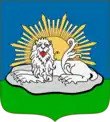 Azure on a base Vert a lion guardant couchant Argent upon a rock Argent, all in front of a sun irradiated Or. The shield covered by a robe of estate in a form of a lion's skin Or, two paws visible; lined Argent and ensigned an ancient crown Or of seven visible points, with a cap Gules.