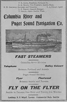 Advertisement for the steamers of the Columbia River and Puget Sound Navigation Company, with Bailey Gatzert and Telephone running on the Columbia River.