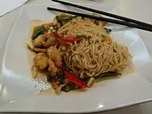 Aside from the namesake bakmi (Indonesian noodle) dishes including mie ayam, the restaurants serve several rice-based and chicken dishes, in addition to popular milk tea drinks. Its most popular and flagship product remains "Bakmi Spesial GM", a noodle dish served with chicken broth, topped with soy sauce chicken, choy sum and mushrooms and priced at around Rp 32,000 (USD 2.2) in 2019.[4] CNN Travel describes the noodles as "iconic", and says the dish "garners a cult following".[5]
