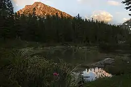 Bald Eagle Lake is a freshwater lake located on the north skirt of Screeching Eagle Peak (elevation point 6,031 ft (1,838 m)),[2] a U-shaped ridge massif formed by the junction of Bald Eagle Peak and Silver Eagle Peak, between the West Fork and East Fork of Foss River, in King County, Washington. Other prominent lakes are south of Bald Eagle Lake, including Locket Lake, Otter Lake and Lake Iiswoot, Opal Lake and other Necklace Valley lakes on the eastern slope of Otter Point. Mount Hinman and Mount Daniel are a short distance southeast.[3] Because Bald Eagle Lake is at the heart of the Alpine Lakes Wilderness, the lake is a popular area for hiking, swimming, and fishing.