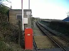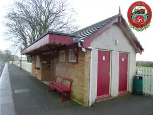 The original building was demolished in 1985 and replaced by a brick building housing a small ticket office and waiting area, which was built in 1985 and was opened in 1986 by Jack Nivison, the former President of the Legislative Council of the Isle of Man and MHK for Middle. Before this, the railway station, like several intermediate stopping places on the line, did not provide passenger platforms. The new building, however, was built at platform height, and the platform was long enough for a five-coach train, later increased to seven. The railway station also has a stone-built water tower and crossing-keeper's hut; the latter was extensively modified to house the now-defunct mechanical railway station gates. A crossing-keeper's house on the other side of the road is now a private dwelling. In 2002 the opposite side of the line also received a full-length platform, which also serves the goods siding, and a modern bus shelter was also installed; the platform edging used had previously been employed for the former South Line departure roads at Douglas railway station and was retained for future use when lifted in 1979. There was also a goods shed on the site — a reused wooden building originally from the prisoner of war camp at Knockaloe near Peel, which was also served by the railway during the First World War. Although now extensively modernised and not really recognisable as the railway station that existed until 1985, it remains one of the most picturesque settings on the line and was popular with photographers who had the opportunity to take images of two trains at once. From 2001 to 2012 this railway station was the only crossing place in regular use on the line, as after timetable changes in 2001 there were no crossing trains at Castletown railway station. However, with the introduction of a more intensive high season timetable in 2012, with six trains each way instead of the usual four, some trains have once again been crossing at Castletown, and all trains from 2015.
