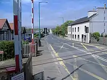 When the railway arrived here the road was little more than a pack-horse road; at its intersection with the railway, traditional level crossing gates were installed. A gatekeeper's house and small lodge were also built; these both still stand: the former is now a private house, whilst the latter remains extant though out of use. It was not until the 1960s that the wooden manually operated gates were replaced with far larger mechanical gates, and the small gate lodge modified to accommodate the "wheelhouse", a small signal box-type structure in a position above the road to increase visibility for the person operating the gates. A series of inter-connected rods beneath the road protected by large metal plates were also extant, but when the whole crossing was relaid in 2000 these were removed and a standard concrete crossing installed. These gates were opened and closed by a large ship's wheel structure which remains in situ. These distinctive gates were a feature of the line and survived until 2001 when, in line with a health and safety ruling, they were removed and replaced with automatic barriers which are now operated by the railway station staff from the platform for departing trains and by treadle activated by trains approaching from a southerly direction. The barriers now in operation tower above the site when in the "off" position; they are long enough to block both carriageways when in use. The crossing is also protected by colour lights to warn motorists of approaching trains, and a set of repeater lights on the exit to Silverburn Way further alert motorists approaching from the south.