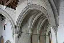 In 1265, a fire burned the timber and oak shingles of the nave to ashes, but the stone portion of the east was left standing. The resulting restorations in 1270 had Gothic elements, including the pointed arches seen throughout.[4]