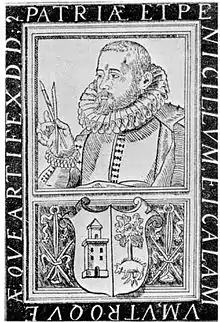 Portrait of Baltasar De Echave in his "Discursos de la antigüedad de la lengua cántabra bascongada" (Speeches on the antiquity of the Basque Cantabrian language), Mexico, Enrico Martínez, 1607.