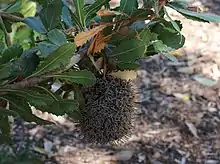 Flowering typically occurs between October and January. Unlike those of most other banksias, the cylindrical inflorescences hang down from branchlets and measure 5–11 cm (2–4 in) in length and 8–10 cm (3.1–3.9 in) in diameter. They are green-yellow in colour and smell of honey, dripping large amounts of nectar. The buds are a rich chocolate brown in colour until the yellow flowers push through. The inflorescences turn grey as they age, and the old flowers remain as up to 20 large woody follicles develop. Oval in shape, wrinkled in texture and covered with fine hair, they can reach 4.5 cm (1.8 in) long, 3 cm (1.2 in) high, and 3 cm (1.2 in) wide.[5]