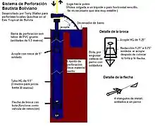 The main drill tool consists of a length of metal pipe with a bit/valve. Extensions are standard PVC potable water pipes.