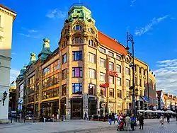 Built from 1902 to 1904 for the German Jewish merchant family Barasch by architect Georg Schneider, the store was opened on 4 October 1904. In 1929, the original art nouveau facade facing the market square was given a simpler, modernist look; the huge glazing above the main entrance was replaced with more conventional window rows. The large glass globe on the main tower at the corner of Ulica Szewska and Kurzy Targ (German: Hintermarkt), which had been damaged by lightning, was also removed.