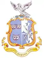 It is a combination of the arms of Archdeacon Barnes, the Founder, on the left side, and that of his wife, who belonged to the Carnac family, on the right. On the left side is a blue shield with the faces of three white leopards and on the right, four-quarters alternately white and blue with crossed swords, three five-pointed stars and a crescent. The swords are in their natural steel colour with the points upward. The stars are blue over the white quarters and white over the blue. Similarly the crescent is white and blue. The bird is a white falcon with golden beak and legs. It is standing on a green mount with six alternate twists of white and blue underneath. The motto, in Latin, Accepto robore susgam can be translated, "I shall arise with the strength I have received."