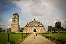 There was a conglomeration of factors that led to the presence of Baroque elements in the architecture of the Philippines, specifically in church architecture. During the Spanish Colonial Period (1521–1898), Spanish missionaries arrived, sharing not only their religion but also their architecture, inspired from their native land. The Spaniards wished to create permanent, long-lasting churches as a testament to the power of God, and did not consider the current church structures in the Philippines as proper places to worship.[4] As most Spanish missionaries were not trained in architecture or engineering, the local townspeople including Filipinos and Chinese migrants, alongside the Spanish friars would take part in the building and design of local churches. The combination of ideas from the missionaries and locals effectively fused native Spanish designs with a uniquely Oriental style. The church's aesthetic was also shaped by limited access to certain materials, and the need to rebuild and adapt to natural disasters including fires and earthquakes, creating a style sometimes referred to as Earthquake Baroque.[5] The Baroque Churches of the Philippines is a serial inscription consisting of four Roman Catholic churches constructed between the 16th and the 18th centuries in the Spanish period of the Philippines. They are located in separate areas of the Philippine archipelago, two at the northern island of Luzon, one at the heart of Intramuros, Manila, and the other in the central Visayas island of Iloilo.[6]