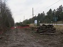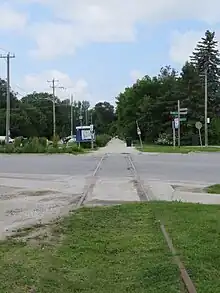 Abandoned BCRY track in Stayner crossing Highway 26 in August 2023, with a trail continuing along the right-of-way beyond. The rails crossing the road were removed shortly afterwards.