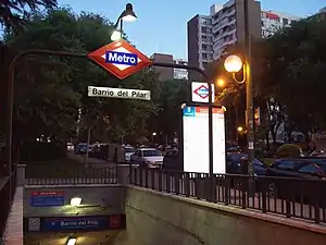 Barrio del Pilar [ˈbarjo ðel piˈlaɾ] is a station on Line 9 of the Madrid Metro, serving the El Pilar neighbourhood (barrio). It is located in fare Zone A.[1]