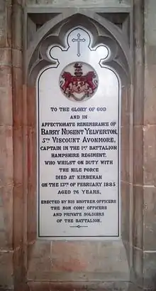 Captain Barry Nugent Yelverton, 5th Viscount Avonmore (11 February 1859 – 13 February 1885), was an Anglo-Irish peer and an officer in the 37th Foot, which was renamed as the Hampshire Regiment in 1881.