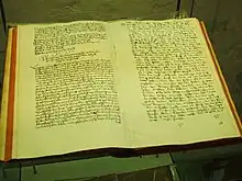 In 1595, at the age of 75, Sastrow wrote an autobiography.[6] He made use of a variety of source materials: in addition to his own journaling and letters, official documents to which he had access as a notary and chronicles such as Johann Berckmann's Stralsund Chronicle and the biography of his predecessor as mayor, Franz Wessel. He modelled his use of these sources on Johannes Sleidanus' history, published in 1545–56.[7] He may also have incorporated sections which he had composed earlier. He had the text written by a scribe; as a result, even the primary manuscript is not by his own hand, although handwriting evidence indicates that he added notes and corrections to the completed text.[8]