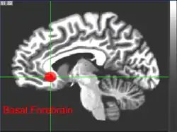 Part of the human brain, the basal forebrain structures are located in the forebrain to the front of and below the striatum. They include the ventral basal ganglia (including nucleus accumbens and ventral pallidum), nucleus basalis, diagonal band of Broca, substantia innominata, and the medial septal nucleus. These structures are important in the production of acetylcholine, which is then distributed widely throughout the brain. The basal forebrain is considered to be the major cholinergic output of the central nervous system (CNS) centred on the output of the nucleus basalis.[1] The presence of non-cholinergic neurons projecting to the cortex have been found to act with the cholinergic neurons to dynamically modulate activity in the cortex.[2]