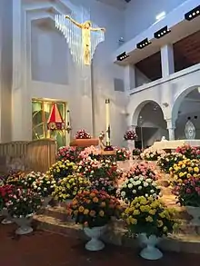 The altar area during the month of May, Mary is the Queen of May. Symbols of its designation as a Minor basilica can be seen, Umbraculum (left) and Tintinnabulum (right).
