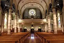 The Romanesque Revival edifice was designed by architect Henry J. Harks of Cleveland, Ohio.[1] Architect Chris Vierheilig of Grand Rapids supervised its construction. The exterior walls of the basilica are covered in limestone from Sandusky, Ohio and it is trimmed in Bedford limestone. The two towers that flank the façade are 134 feet (41 m) high and the large central dome rises to 134 feet (41 m) above the ground.[1] The dome reflects Byzantine influence while the facade's large rose window reveals Gothic influence. The basilica's stained glass windows were designed by A. Artmaier and created by craftsmen from Munich, Germany. Edmund Verlinden designed the altars, pulpit, baptismal font, and confessionals. The original communion rail was topped with Georgia marble. The pews were crafted by the American Seating Company of Grand Rapids, a nod to the city's large furniture industry.