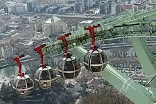 In August 1976, the lower station was rebuilt slightly back from the quay so that the road no longer passed through an archway, and the spherical cabins ("the bubbles", 5 in summer and 4 in winter) made their first appearance. They were manufactured by the local company Poma and quickly dubbed the "bubbles".