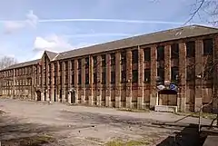 Built in brick as a silk mill in 1851, it was three storeys high and 12 bays wide with cast-iron attic windows made at the local foundry. At the north end, there was a small building at right angles built to house the steam engine which powered the mill. In 1868, the mill was extended southwards by a further 20 bays by the architect S Morley. The roof line shows the join.