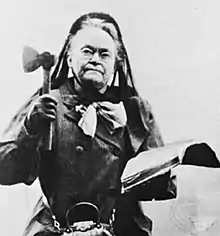The prime example was the militant temperance activist Carrie Nation, who actually wielded a hatchet and made it her symbol, living in Hatchet Hall and publishing a magazine called The Hatchet. She became involved in the suffragette campaign for votes for women and this campaign further established the archetype.[2][1][3]