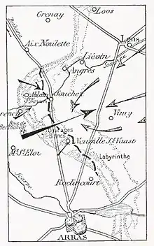 The Battle of Arras (also known as the First Battle of Arras to differentiate it from the better-known 1917 battle) was fought on 9 May 1915 on the Western Front in France. The so-called Bayonne Legion (a French Foreign Legion infantry unit which consisted of ethnic Polish volunteers) clashed with troops of the Imperial German Army, defending the hill of Vimy, located 10 kilometers north of Arras, France. The Czechoslovak battalion Nazdar also took part in the engagement, the first battle of what would become the Czechoslovak Legion, and was nearly wiped out in the process.[1]