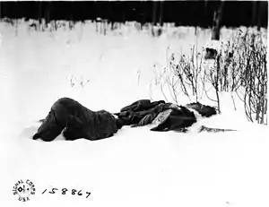 ![]() A Workers’ and Peasants’ Red Army soldier that was killed during an attempted flank attack on Allied positions along the Obozerskaya road at Verst 16. April 8, 1919 | |||||||