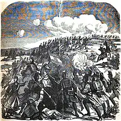 Guyon led the column attacking from the front, and, as he did not speak Hungarian well, he addressed the following speech to them, interspersing Hungarian and German words: Vorwärts dupla lénung, rückwärts kartács schiessen.[10] Which in English means something like: “If you go forward, you get double pay, if you retreat, I'll receive you with grapeshots”'.[10] However the attack led by the 33rd Honvéd Battalion was soon repulsed, because the Hungarian cannons, positioned near Korotnok, could not be effectively support the infantry, being on a much lower ground than the attacking soldiers.[8] When the Honvéds retreated, they found themselves confronted by Guyon's cannons, who fulfilled his vow and fired into them,[10] leaving one officer and 10 soldiers dead or wounded.[12] Guyon's center was then contented with a stationary artillery duel until the columns sent against the enemy's right and left and partly in its rear, appeared on the mountaintops surrounding the pass.[8] Then, at about 3 p.m., the 33rd Honvéd Battalion renewed its attack, but this did not go smoothly either.[8]