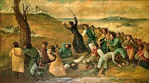 He was also assisted by the Piarist friar Imre Poleszni (Erdősi), who encouraged the Slovak nationality soldiers of the Zólyom County rookie battalion.[10] And when the attack stalled, Father Erdősi threw the one meter-long cross he was carrying into the snow in front of him, and shouted to the soldiers in Slovak: "Come on, my sons! Would you leave the Lord to these heathens?"[12] That was enough to make the soldiers turn around, climb the barricades, and force the imperials to retreat.[10]
