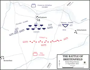 The Battle of Breitenfeld (German: Schlacht bei Breitenfeld; Swedish: Slaget vid Breitenfeld) or First Battle of Breitenfeld (in older texts sometimes known as Battle of Leipzig), was fought at a crossroads near Breitenfeld approximately 8 km north-west of the walled city of Leipzig on 17 September (Gregorian calendar), or 7 September (Julian calendar, in wide use at the time), 1631.[lower-alpha 2][lower-alpha 1] A Swedish-Saxon army led by King Gustavus Adolphus of Sweden and Saxon Elector John George I defeated an Imperial-Catholic League Army led by Generalfeldmarschall Johann Tserclaes, Count of Tilly. It was the Protestants' first major victory of the Thirty Years War.