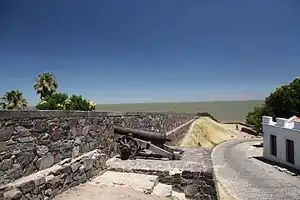 Frigate captain Frederico Mariath, the commander of the Brazilian ships in Colonia del Sacramento, had convened a council to decide how the defence of the town should be carried out. Mariath suggested that his four ships be anchored under the protection of the bastions of Carmen and Santa Rita, with their sides facing the port, as to provide fire support. This proposal was accepted by Jorge Rodrigues. Eight of the ships' cannons were disembarked to form two batteries on land: one was placed at the Tambor bastion, in order to protect the ships and to prevent the Argentines from disembarking on the town's mole, and the other was placed between the bastions of São Pedro and São Miguel.[16] Four hours after having sent his envoy and upon receiving the answer, admiral Brown ordered his men to begin the attack on Colonia del Sacramento.[15]