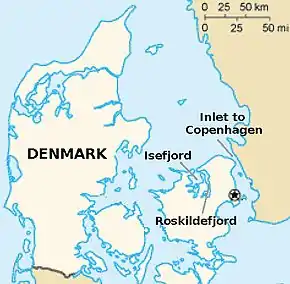 Where the Battle of Copenhagen harbour occurred in 1801, and where Roskildefjord is located. It could have been hazardous for the Royal Navy to sail into the fjord, which is very narrow