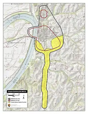 Harding, who was now in command of the garrison at Glasgow, had between 550 and 800 men available,[38][39] including armed civilians.[40] The Union force had no artillery available.[35] Glasgow's location on a hilltop provided an advantage to the defenders. The interior Union line was anchored by two unfinished fortifications which held about 40 men each. The defenses between the fortifications were makeshift, although they had been extended to the east to a schoolhouse. Most of Harding's men were positioned outside the fortified line where the roads entered town.[38] This interior line ran from near the river to the east edge of town, before curving to the north.[41] Elements of the 43rd Missouri Infantry held east and west positions south of town on the external line, near where the roads crossed Greggs Creek. In between those two positions, a line of local militiamen was posted.[39] The two road crossings were over 1 mile (1.6 km) apart.[42] The line south of town ran roughly east to west.[41] North of the town, a group of cavalry, largely members of the Missouri State Militia, held a position north of Bear Creek,[38][39] crossed by a single road.[42] A militia force was sent east to repair telegraphic connections with Jefferson City, but returned to Glasgow late on October 14 after running into a Confederate force.[37] At around 05:00 on October 15, Collins's Battery opened fire, aiming primarily for West Wind, visible campfires, and exposed streets in the town. This fire was largely ineffective, as was fire from the cavalry accompanying the cannons,[41][43] although a prominent pro-Confederate civilian, clergyman William Goff Caples, was killed by an artillery shot.[37] Union sharpshooters drove some Confederates away from the riverbank.[41][43]