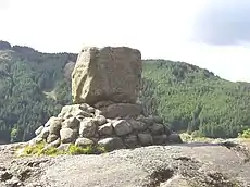 Bruce's Stone is a large granite boulder commemorating King Robert's victory in 1307. It is atop the hill on the north side of Loch Trool. In 1929, on the 600th anniversary of Bruce's death, it was placed high above the northern shore of Loch Trool, from where, legend has it, he had commanded the ambush that took place on the Steps of Trool on the other side of the loch. It also serves as a starting spot for the challenging walk up Merrick (2764 feet), the highest mountain in southern Scotland.[7]